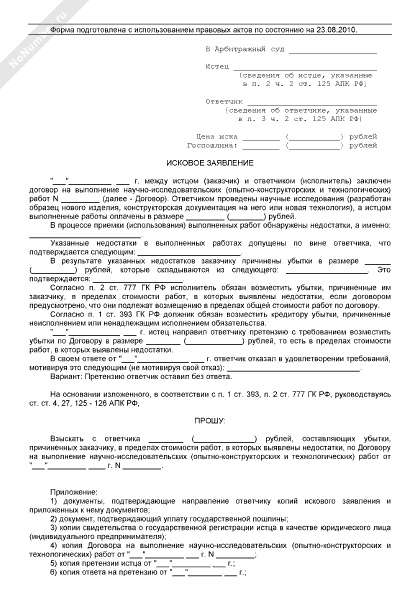 - 647Исковое заявление заказчика по договору на выполнение научно-исследовательских, опытно-конструкторских и технологических работ в арбитражный суд о взыскании с исполнителя убытков, причиненных им заказчику, в пределах стоимости работ, в которых выявлены недостатки