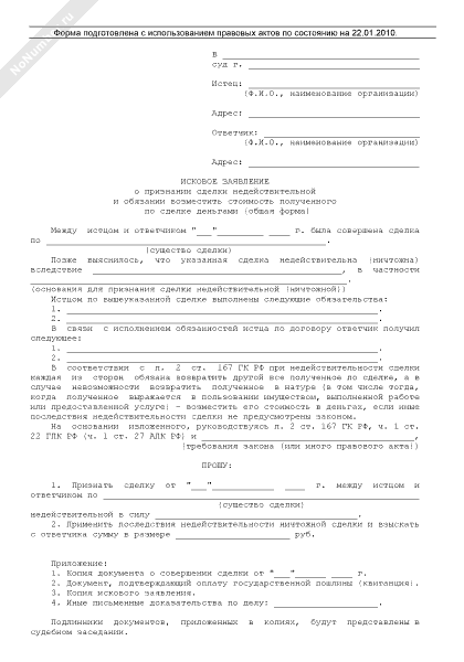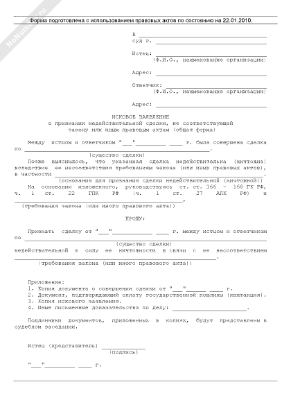 - 693Исковое заявление о признании недействительной сделки, не соответствующей закону или иным правовым актам (общая форма)