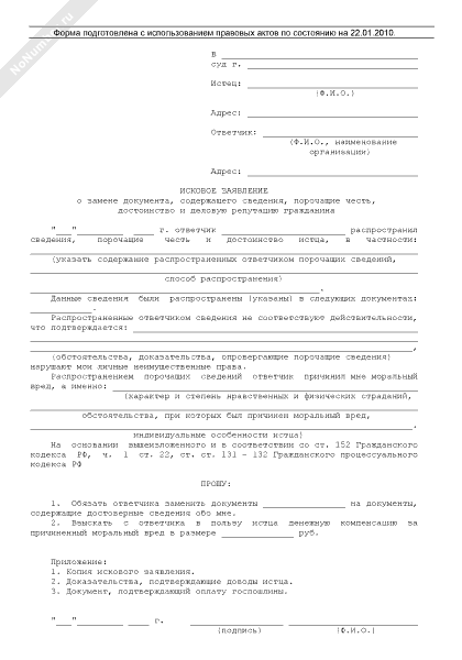 - 684Исковое заявление в суд общей юрисдикции о замене документа, содержащего сведения, порочащие честь, достоинство и деловую репутацию гражданина