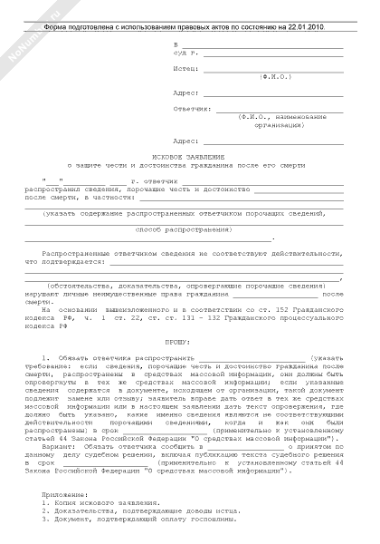 - 682Исковое заявление в суд общей юрисдикции о защите чести и достоинства гражданина после его смерти