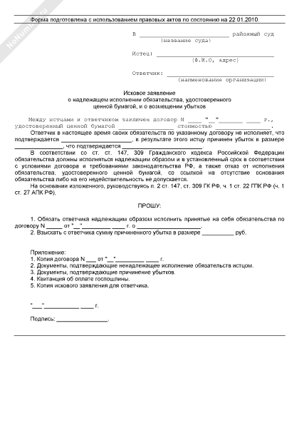 - 681Исковое заявление в суд общей юрисдикции о надлежащем исполнении обязательства, удостоверенного ценной бумагой, и о возмещении убытков