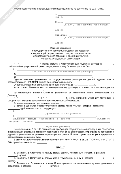 - 689Исковое заявление в суд общей юрисдикции о государственной регистрации сделки, совершенной в надлежащей форме, в связи с тем, что одна из сторон уклоняется от ее регистрации, и взыскании убытков, связанных с задержкой регистрации
