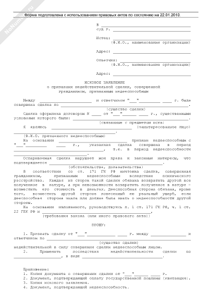 - 696Исковое заявление в суд общей юрисдикции о признании недействительной сделки, совершенной гражданином, признанным недееспособным