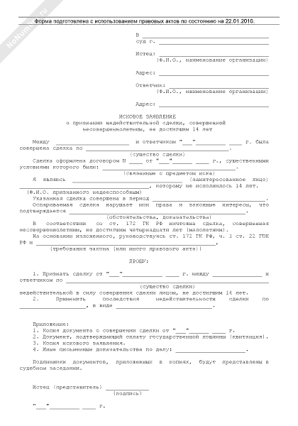 - 698Исковое заявление в суд общей юрисдикции о признании недействительной сделки, совершенной несовершеннолетним, не достигшим 14 лет