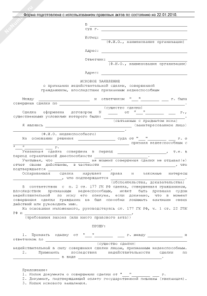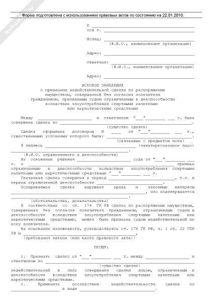 - 702Исковое заявление в суд общей юрисдикции о признании недействительной сделки по распоряжению имуществом, совершенной без согласия попечителя гражданином, признанным судом ограниченным в дееспособности вследствие злоупотребления спиртными напитками или наркотическими средствами
