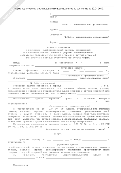 - 705Исковое заявление о признании недействительной сделки, совершенной под влиянием обмана, насилия, угрозы, злонамеренного соглашения представителя одной стороны с другой стороной или стечения тяжелых обстоятельств (общая форма)