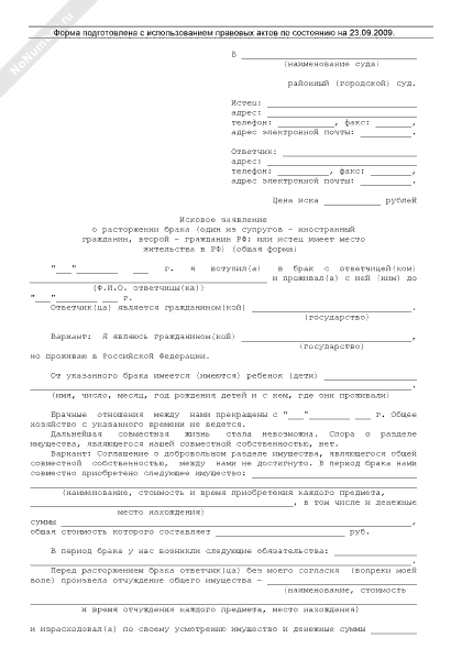 - 713Исковое заявление в суд общей юрисдикции о расторжении брака (один из супругов — иностранный гражданин, второй — гражданин РФ; или истец имеет место жительства в РФ) (общая форма)