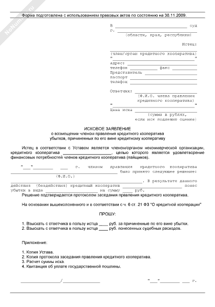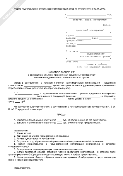 - 718Исковое заявление о возмещении убытков, причиненных кредитному кооперативу по вине его единоличного исполнительного органа