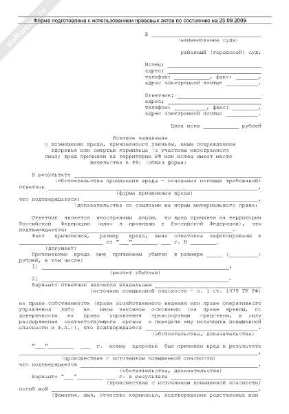 - 711Исковое заявление в суд общей юрисдикции о возмещении вреда, причиненного увечьем, иным повреждением здоровья или смертью кормильца (с участием иностранного лица; вред причинен на территории РФ или истец имеет место жительства в РФ) (общая форма)