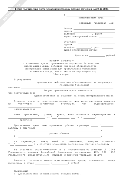 - 712Исковое заявление в суд общей юрисдикции о возмещении вреда, причиненного имуществу (с участием иностранного лица; действие или иное обстоятельство, послужившие основанием для предъявления требования о возмещении вреда, имело место на территории РФ) (общая форма)