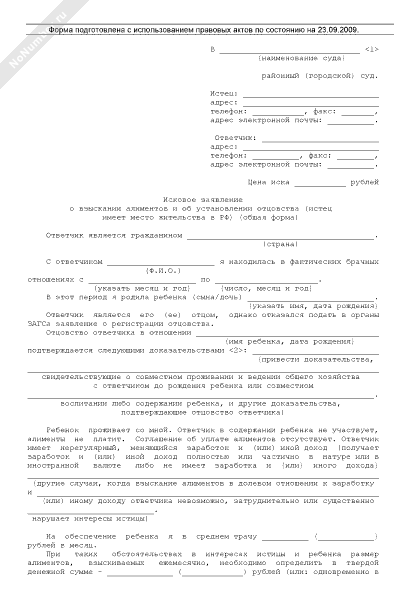 - 710Исковое заявление в суд общей юрисдикции о взыскании алиментов и об установлении отцовства (истец имеет место жительства в РФ) (общая форма)