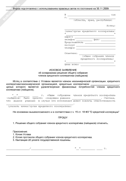 - 716Исковое заявление об оспаривании решения общего собрания членов кредитного кооператива (пайщиков), исполнение которого может повлечь ответственность членов иных органов кредитного кооператива