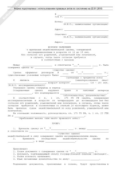 - 701Исковое заявление в суд общей юрисдикции о признании недействительной сделки, совершенной несовершеннолетним в возрасте от 14 до 18 лет, без согласия его родителей, усыновителей или попечителя, в случаях, когда такое согласие требуется в соответствии с законом