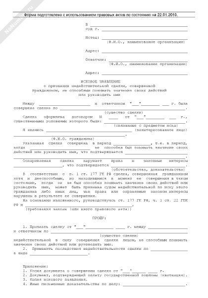 - 703Исковое заявление в суд общей юрисдикции о признании недействительной сделки, совершенной гражданином, не способным понимать значение своих действий или руководить ими