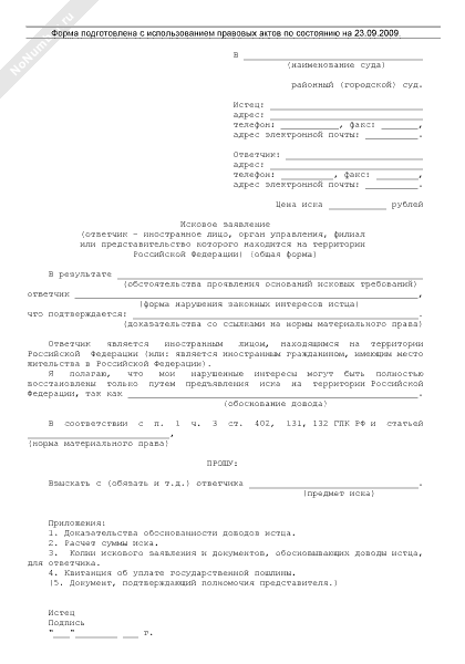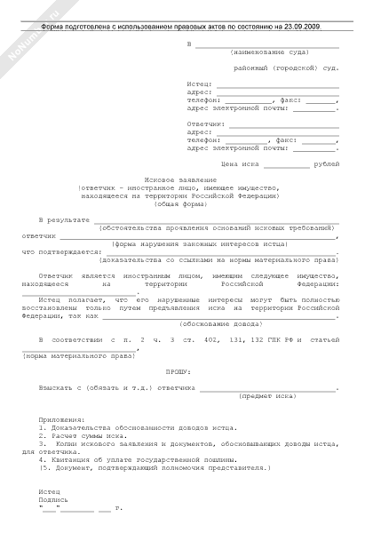- 709Исковое заявление в суд общей юрисдикции (ответчик — иностранное лицо, имеющее имущество, находящееся на территории Российской Федерации) (общая форма)