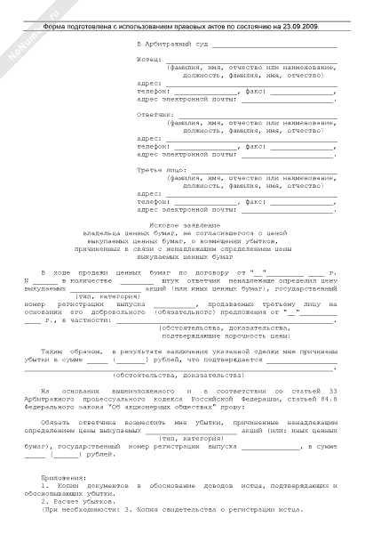 - 715Исковое заявление владельца ценных бумаг, не согласившегося с ценой выкупаемых ценных бумаг, о возмещении убытков, причиненных в связи с ненадлежащим определением цены выкупаемых ценных бумаг