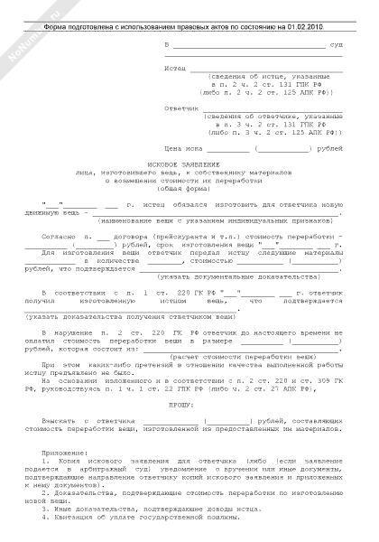 - 755Исковое заявление лица, изготовившего вещь, к собственнику материалов о возмещении стоимости их переработки (общая форма)