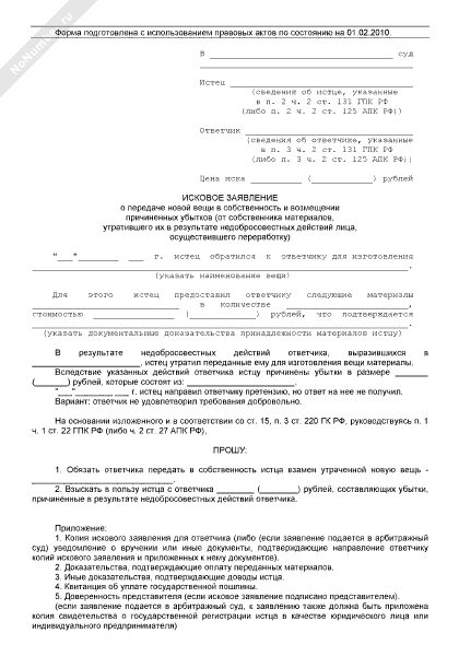 - 756Исковое заявление о передаче новой вещи в собственность и возмещении причиненных убытков (от собственника материалов, утратившего их в результате недобросовестных действий лица, осуществившего переработку)