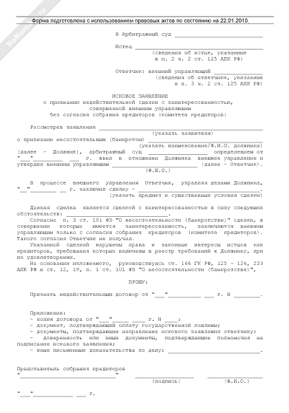 - 749Исковое заявление в арбитражный суд о признании недействительной сделки с заинтересованностью, совершенной внешним управляющим без согласия собрания кредиторов (комитета кредиторов)