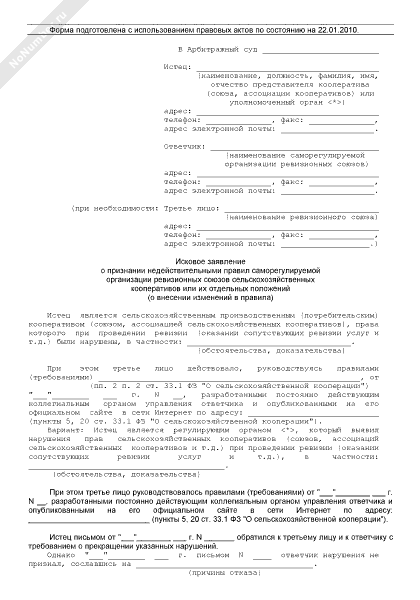 - 760Исковое заявление о признании недействительными правил саморегулируемой организации ревизионных союзов сельскохозяйственных кооперативов или их отдельных положений (о внесении изменений в правила)