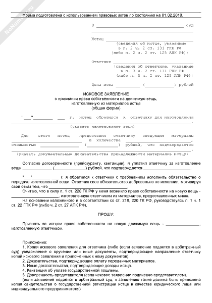 - 752Исковое заявление о признании права собственности на движимую вещь, изготовленную из материалов истца (общая форма)