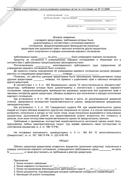 - 745Исковое заявление в арбитражный суд о возврате кредиторами, требования которых были удовлетворены в соответствии с условиями мирового соглашения, предусматривающими преимущества указанных кредиторов или ущемление прав и законных интересов других кредиторов, всего полученного в порядке исполнения мирового соглашения
