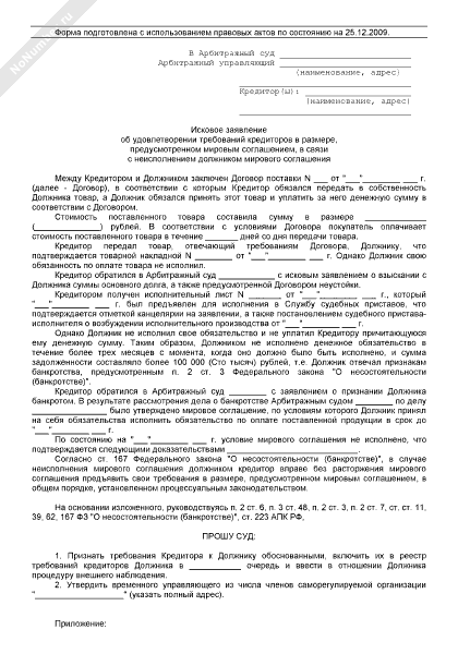 - 746Исковое заявление в арбитражный суд об удовлетворении требований кредиторов в размере, предусмотренном мировым соглашением, в связи с неисполнением должником мирового соглашения (на примере договора поставки)