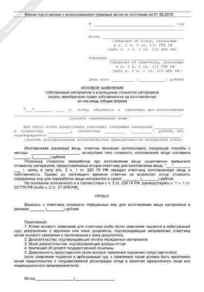 - 754Исковое заявление собственника материалов о возмещении стоимости материалов лицом, приобретшим право собственности на изготовленную из них вещь (общая форма)