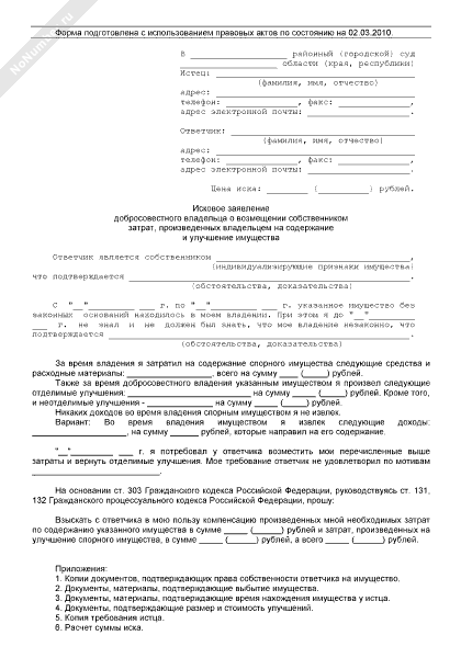 - 854Исковое заявление добросовестного владельца в суд общей юрисдикции о возмещении собственником затрат, произведенных владельцем на содержание и улучшение имущества