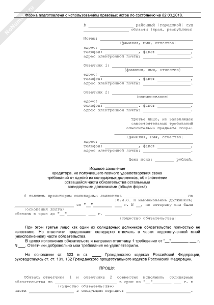 - 857Исковое заявление кредитора в суд общей юрисдикции об исполнении обязательства ко всем солидарным должникам (общая форма)