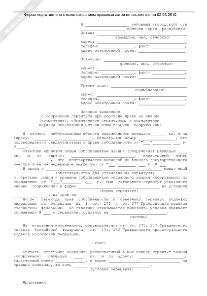 - 848Исковое заявление в суд общей юрисдикции о сохранении сервитута при переходе права на здание (сооружение), обремененное сервитутом, и определении порядка пользования истцом этим зданием (сооружением)