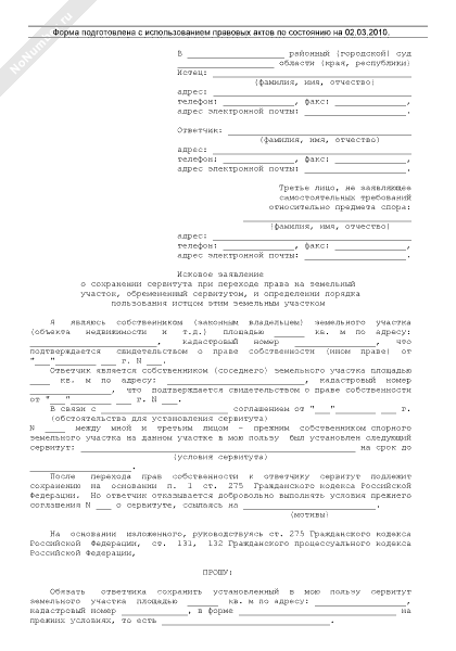 - 846Исковое заявление в суд общей юрисдикции о сохранении сервитута при переходе права на земельный участок, обремененный сервитутом, и определении порядка пользования истцом этим земельным участком