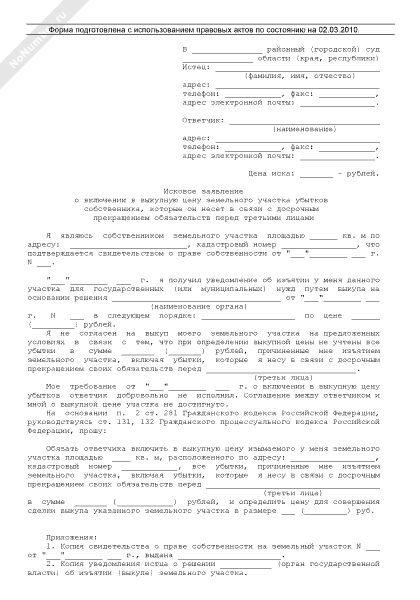 - 850Исковое заявление в суд общей юрисдикции о включении в выкупную цену земельного участка убытков собственника, которые он несет в связи с досрочным прекращением обязательств перед третьими лицами