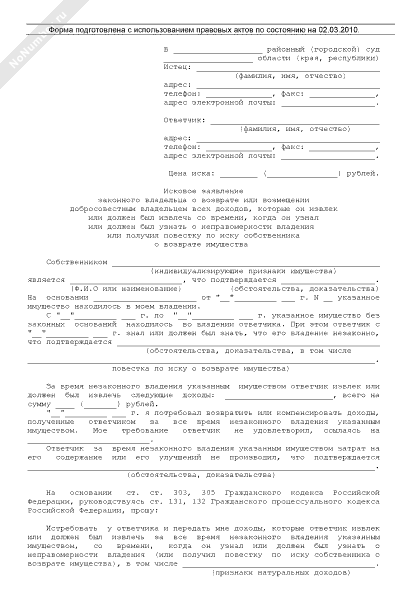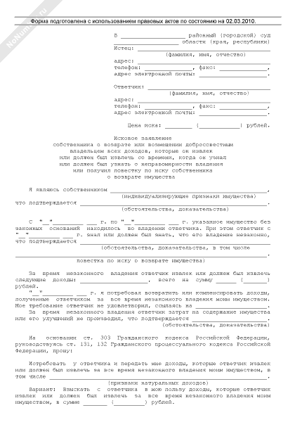 - 853Исковое заявление собственника в суд общей юрисдикции о возврате или возмещении добросовестным владельцем всех доходов, которые он извлек или должен был извлечь со времени, когда он узнал или должен был узнать о неправомерности владения или получил повестку по иску собственника о возврате имущества