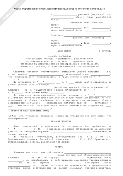 - 844Исковое заявление собственника земельного участка, на котором расположен объект недвижимости, о признании права собственника земельного участка на приобретение оставшейся на нем недвижимости (в суд общей юрисдикции)