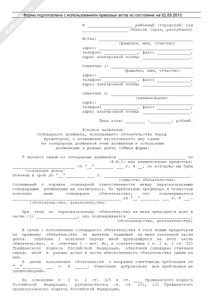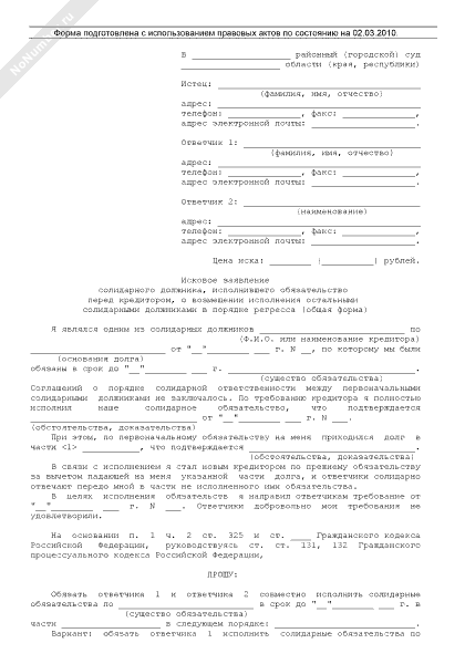 - 859Исковое заявление солидарного должника, исполнившего обязательство перед кредитором, в суд общей юрисдикции о возмещении исполнения остальными солидарными должниками в порядке регресса (общая форма)
