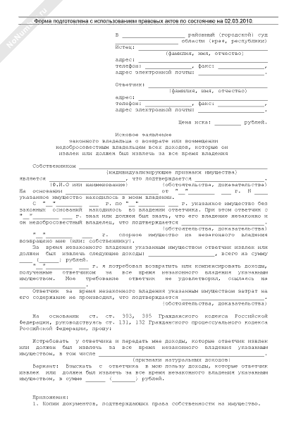 - 855Исковое заявление законного владельца в суд общей юрисдикции о возврате или возмещении недобросовестным владельцем всех доходов, которые он извлек или должен был извлечь за все время владения
