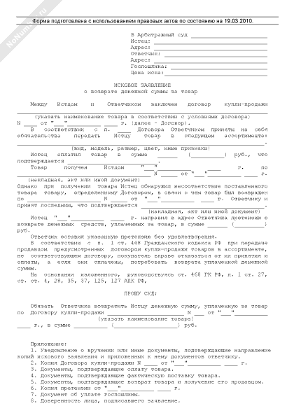 - 1009Исковое заявление покупателя в арбитражный суд о возврате продавцом уплаченной за товар денежной суммы в связи с тем, что продавец передал в нарушение договора купли-продажи покупателю меньшее количество товара, чем определено договором
