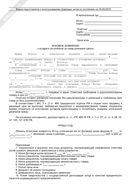 - 1019Исковое заявление покупателя в арбитражный суд о возврате продавцом уплаченной за товар денежной суммы в связи с передачей некомплектного товара
