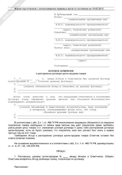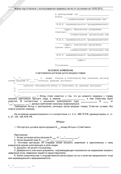 - 1001Исковое заявление покупателя в арбитражный суд о расторжении договора купли-продажи товара, обремененного правами третьих лиц, о которых покупатель не знал и не должен был знать до заключения договора