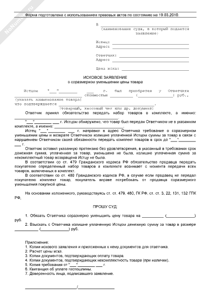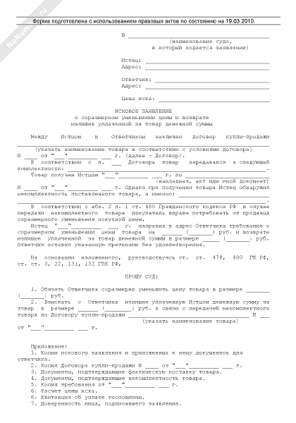- 1020Исковое заявление покупателя в суд общей юрисдикции о соразмерном уменьшении цены товара и возврате продавцом излишне уплаченной за товар денежной суммы в связи с нарушением продавцом обязанности передать покупателю комплект товаров
