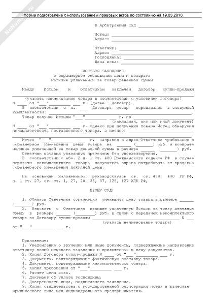 - 1014Исковое заявление покупателя в арбитражный суд о соразмерном уменьшении цены товара и возврате продавцом излишне уплаченной за товар денежной суммы в связи с передачей некомплектного товара