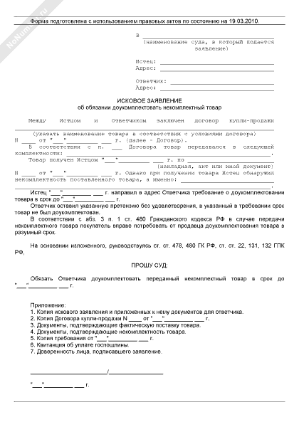 - 1015Исковое заявление покупателя в суд общей юрисдикции об обязании продавца доукомплектовать переданный некомплектный товар