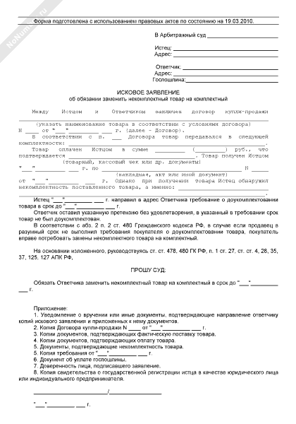 - 1016Исковое заявление покупателя в арбитражный суд об обязании продавца доукомплектовать переданный некомплектный товар