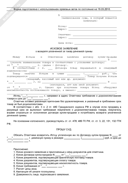 - 1018Исковое заявление покупателя в суд общей юрисдикции о возврате продавцом уплаченной за товар денежной суммы в связи с передачей некомплектного товара