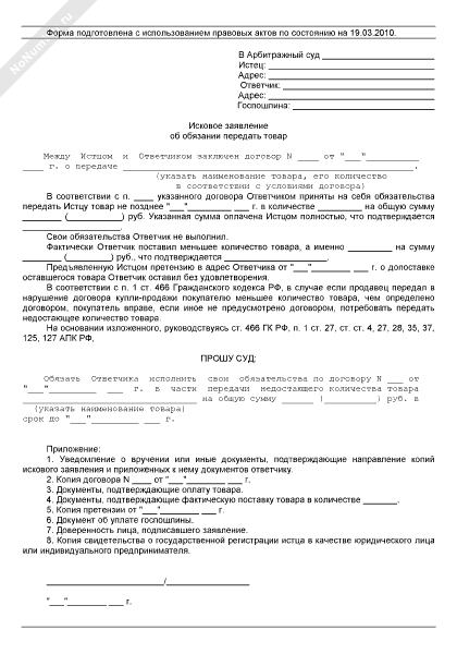 - 1008Исковое заявление в арбитражный суд об обязании продавца передать покупателю недостающее количество товара