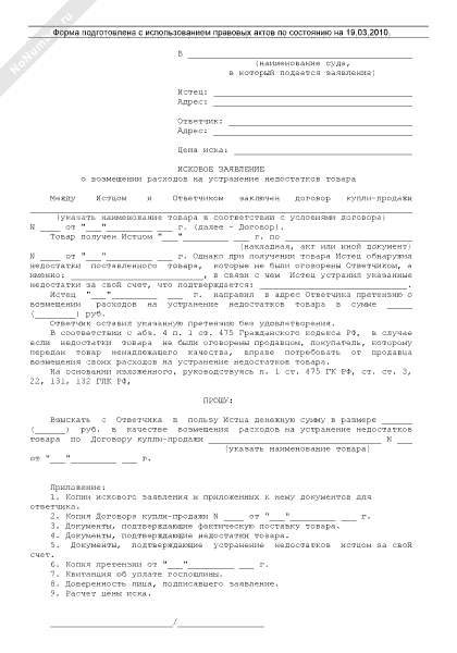 - 1012Исковое заявление в арбитражный суд о возмещении продавцом расходов покупателя на устранение недостатков товара