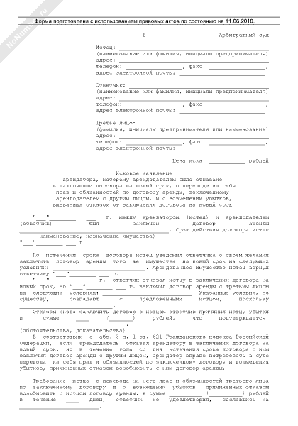 - 1199Исковое заявление арендатора, которому арендодателем было отказано в заключении договора на новый срок, в арбитражный суд о переводе на себя прав и обязанностей по договору аренды, заключенному арендодателем с другим лицом, и о возмещении убытков, вызванных отказом от заключения договора на новый срок