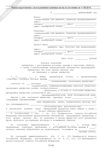 - 1189Исковое заявление арендатора в арбитражный суд о расторжении договора аренды и взыскании убытков в связи с неисполнением арендодателем обязанности предупредить арендатора обо всех правах третьих лиц на сдаваемое в аренду имущество