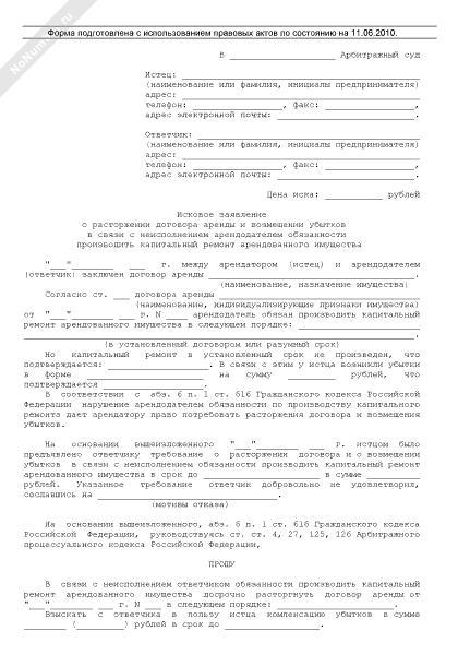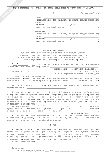 - 1195Исковое заявление арендодателя в арбитражный суд о досрочном расторжении договора аренды в связи с тем, что арендатор не производит капитального ремонта имущества в установленные договором аренды сроки, а при отсутствии их в договоре — в разумные сроки в случае, когда в соответствии с законом, иными правовыми актами или договором производство капитального ремонта является обязанностью арендатора